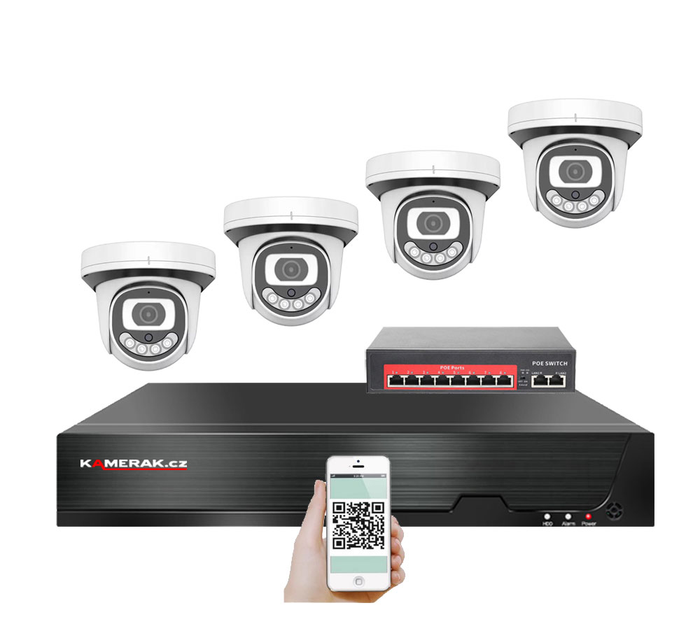 IP kamerový set s externím PoE pro jednoduché sestavení svépomocí. NVR v sobě nemá instalováno napájení kamer, které je řešeno pomocí switch. Lze tedy umístit switch (napájení IP kamer) na jiné místo než rekordér, který se následně připojuje k obrazovce/internetu.