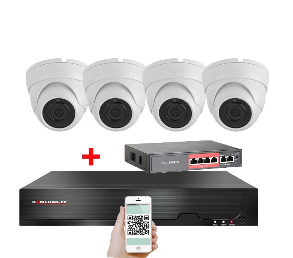 IP kamerový set s externím PoE pro jednoduché sestavení svépomocí. NVR v sobě nemá instalováno napájení kamer, které je řešeno pomocí switch. Lze tedy umístit switch (napájení IP kamer) na jiné místo než rekordér, který se následně připojuje k obrazovce/internetu.