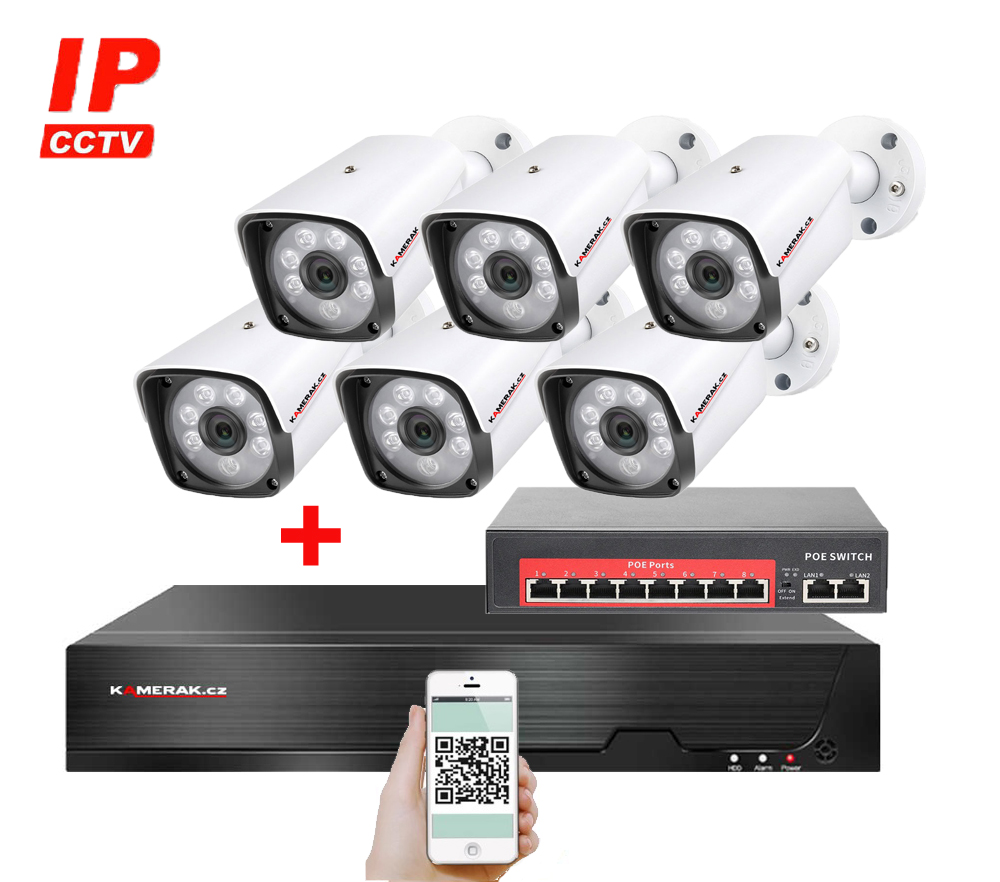 IP kamerový set s externím PoE pro jednoduché sestavení svépomocí. NVR v sobě nemá instalováno napájení kamer, které je řešeno pomocí switch. Lze tedy umístit switch (napájení IP kamer) na jiné místo než rekordér, který se následně připojuje k obrazovce/internetu.