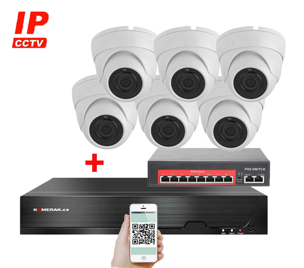 IP kamerový set s externím PoE pro jednoduché sestavení svépomocí. NVR v sobě nemá instalováno napájení kamer, které je řešeno pomocí switch. Lze tedy umístit switch (napájení IP kamer) na jiné místo než rekordér, který se následně připojuje k obrazovce/internetu.