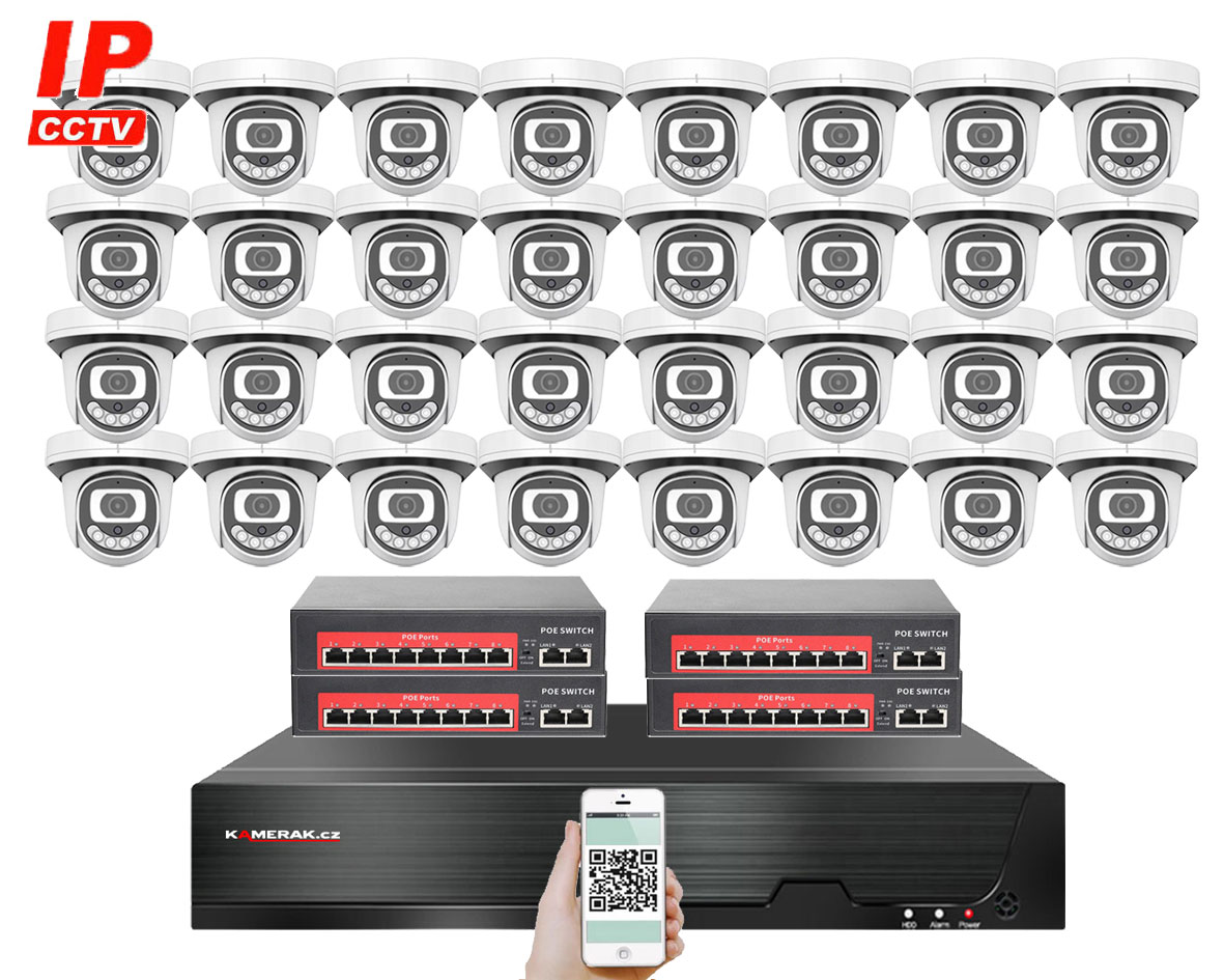 IP kamerový set s externím PoE pro jednoduché sestavení svépomocí. NVR v sobě nemá instalováno napájení kamer, které je řešeno pomocí switch. Lze tedy umístit switch (napájení IP kamer) na jiné místo než rekordér, který se následně připojuje k obrazovce/internetu.