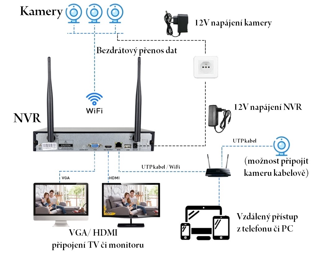 Přístup odkudkoliv, pokud systém připojíte k Vašemu routeru (internetu) ať už kabelově (doporučený způsob připojení) nebo pomocí WiFi (nedoporučeno, omezený dosah), máte možnost se bezplatně připojit k systému odkudkoli kde máte přístup k internetu pomocí Vašeho telefonu (Android i iOS) nebo pomocí PC či Mac, což Vám umožní nahlížet na obraz kamer, do záznamů či získávat upozornění o narušení prostoru. Připojení k internetu není podmínkou k provozu systému.