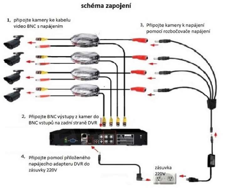 Velmi jednoduchá instalace kamerového systému, stačí pouze zapojit samotné kamery k rekordéru a ten připojit k monitoru/TV (HDMI/VGA), samozřejmostí je zapojení do elektrické sítě. Složitost připojení lze srovnat s připojením DVD přehrávače, tudíž instalaci zvládne opravdu každý. Připojením kamerového setu k internetu získáte funkci vzdáleného sledování na Vašem telefonu/mobilu.
