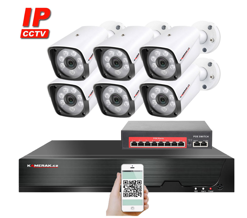 IP kamerový set s externím PoE pro jednoduché sestavení svépomocí. NVR v sobě nemá instalováno napájení kamer, které je řešeno pomocí switch. Lze tedy umístit switch (napájení IP kamer) na jiné místo než rekordér, který se následně připojuje k obrazovce/internetu.
