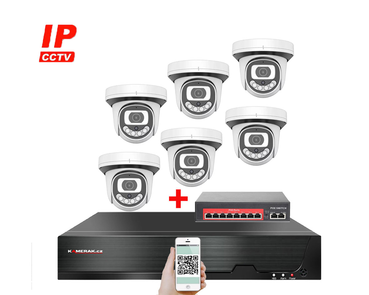 IP kamerový set s externím PoE pro jednoduché sestavení svépomocí. NVR v sobě nemá instalováno napájení kamer, které je řešeno pomocí switch. Lze tedy umístit switch (napájení IP kamer) na jiné místo než rekordér, který se následně připojuje k obrazovce/internetu.