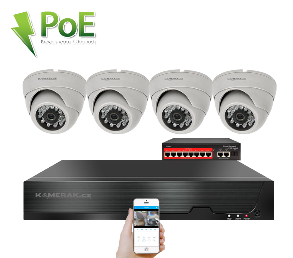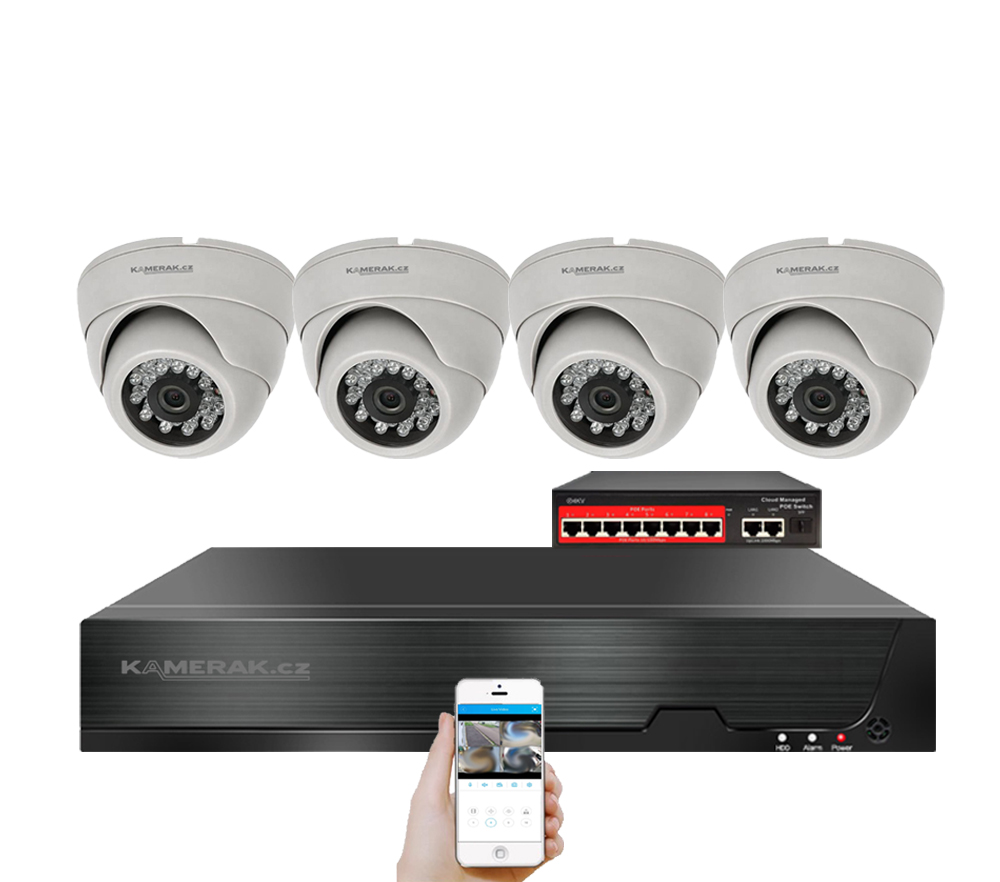 IP kamerový set s externím PoE pro jednoduché sestavení svépomocí. NVR v sobě nemá instalováno napájení kamer, které je řešeno pomocí switch. Lze tedy umístit switch (napájení IP kamer) na jiné místo než rekordér, který se následně připojuje k obrazovce/internetu.