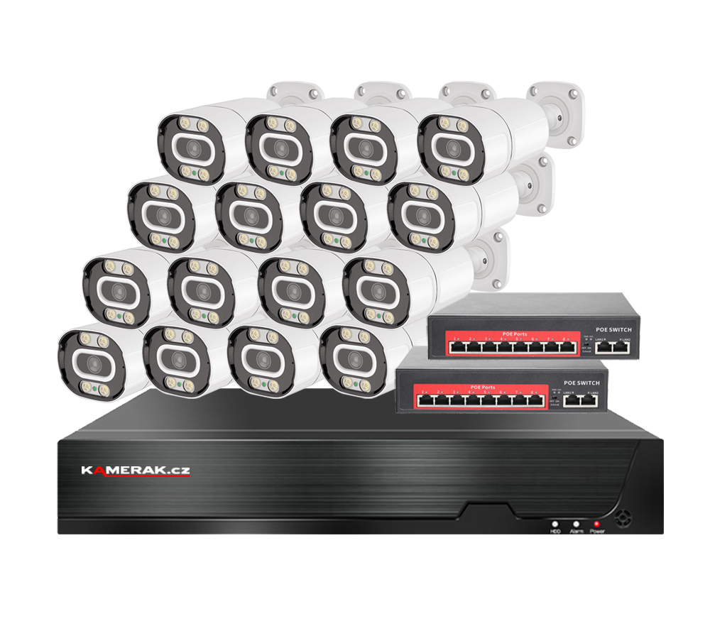 IP kamerový set s externím PoE pro jednoduché sestavení svépomocí. NVR v sobě nemá instalováno napájení kamer, které je řešeno pomocí switch. Lze tedy umístit switch (napájení IP kamer) na jiné místo než rekordér, který se následně připojuje k obrazovce/internetu.