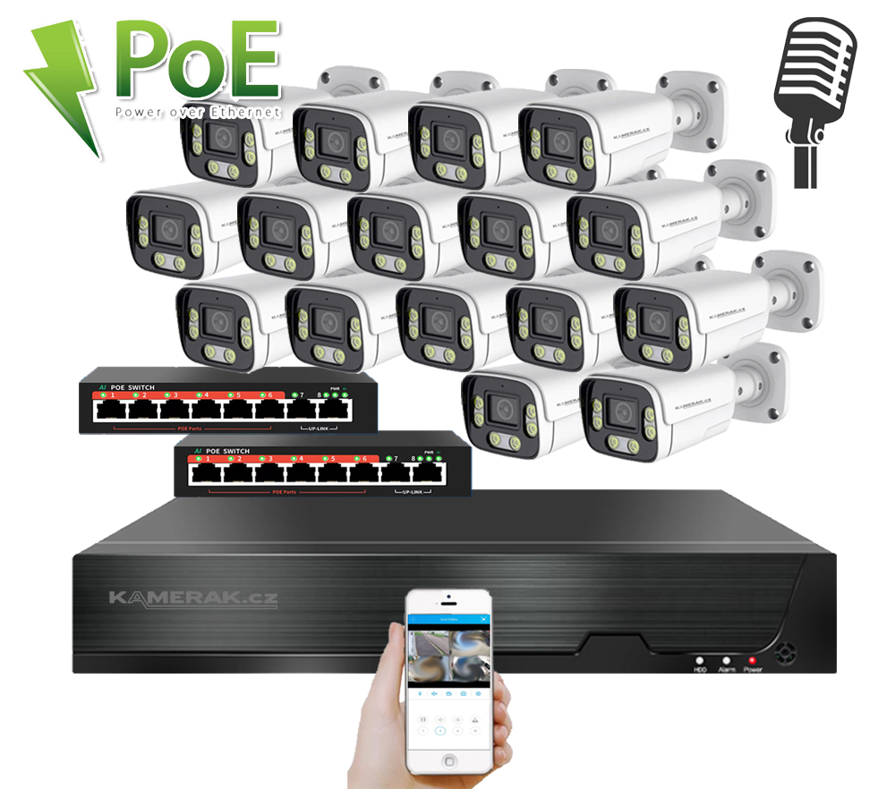 IP kamerový set 16x 8MPx s externím PoE. Snadná instalace, české menu a vzdálený přístup přes mobil. Ideální pro zabezpečení vašeho prostoru.