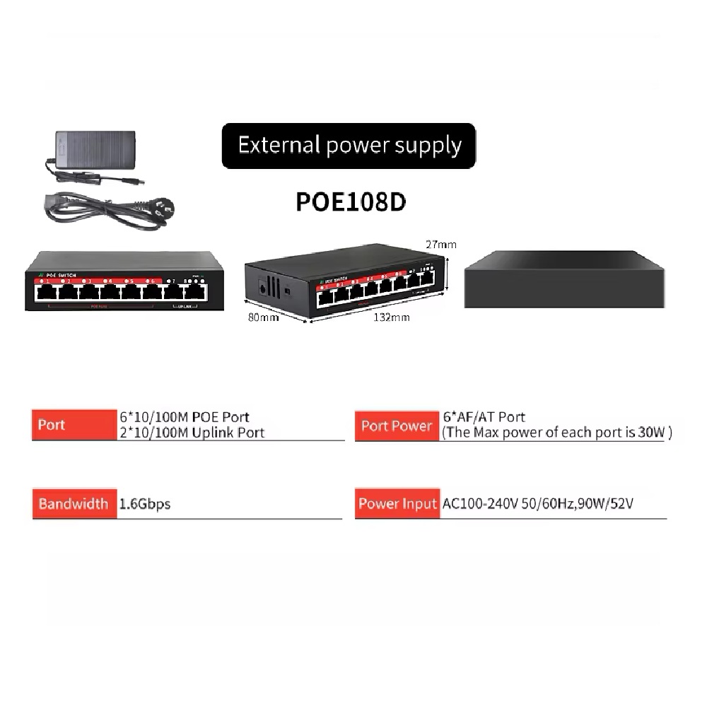 Představujeme 100M Ethernet PoE switch POE108D, navržený pro efektivní napájení a správu vaší sítě. Tento switch nabízí 8 adaptivních portů RJ45 s rychlostí 10/100M, přičemž porty 1 až 6 disponují funkcí PoE napájení a mohou sloužit jako zařízení pro ethernetové napájení. Všechny napájecí porty automaticky detekují a identifikují zařízení splňující standard IEEE 802.3af/at. Klíčovou vlastností tohoto modelu je inteligentní detekce pomocí umělé inteligence (AI). V případě selhání monitorovacího zařízení nebo jiných neobvyklých přerušení sítě, AI algoritmus situaci vyhodnotí a inteligentně restartuje daný PoE port. Switch také automaticky optimalizuje síťový provoz; posuzuje stav přenosu síťového signálu a inteligentně přepíná do režimu ultra dlouhé vzdálenosti, což zajišťuje stabilní přenos na velké vzdálenosti bez výpadků.