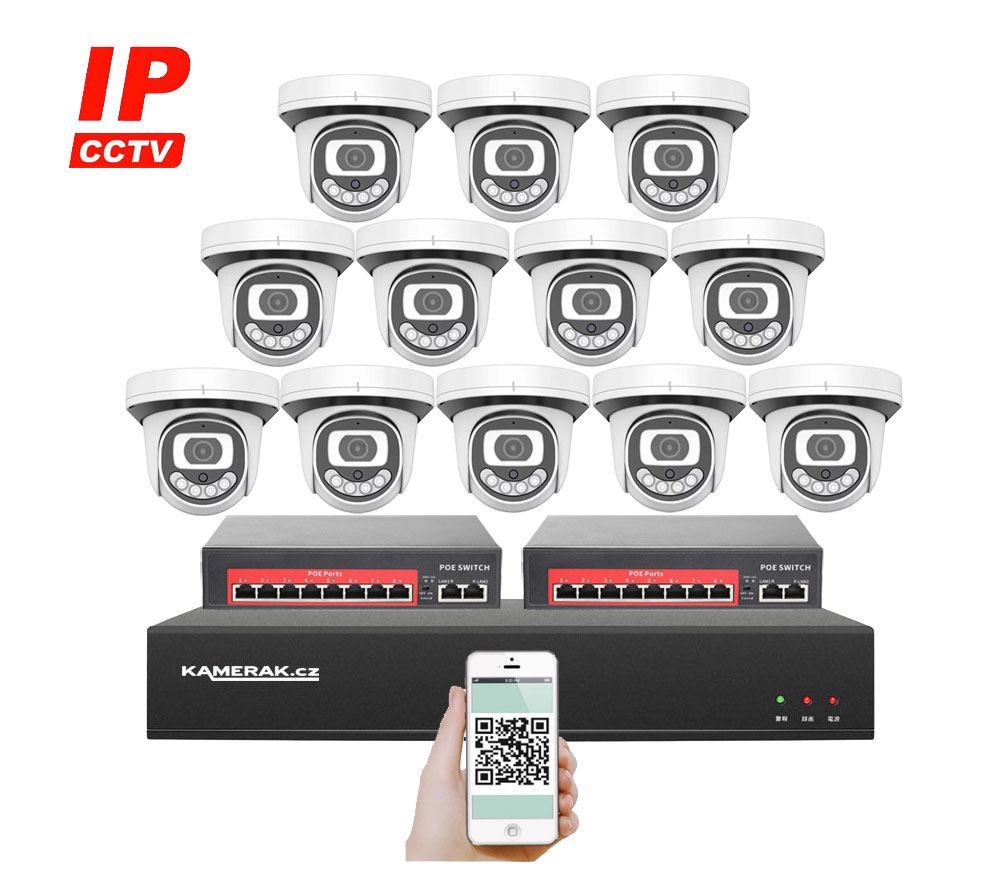 IP kamerový set s externím PoE pro jednoduché sestavení svépomocí. NVR v sobě nemá instalováno napájení kamer, které je řešeno pomocí switch. Lze tedy umístit switch (napájení IP kamer) na jiné místo než rekordér, který se následně připojuje k obrazovce/internetu.