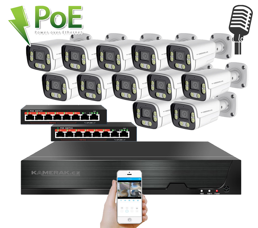 Kamerový set IP 12 s externím PoE, 4MPx a mikrofonem. Snadná instalace, české menu a vzdálený přístup na mobilu či PC.