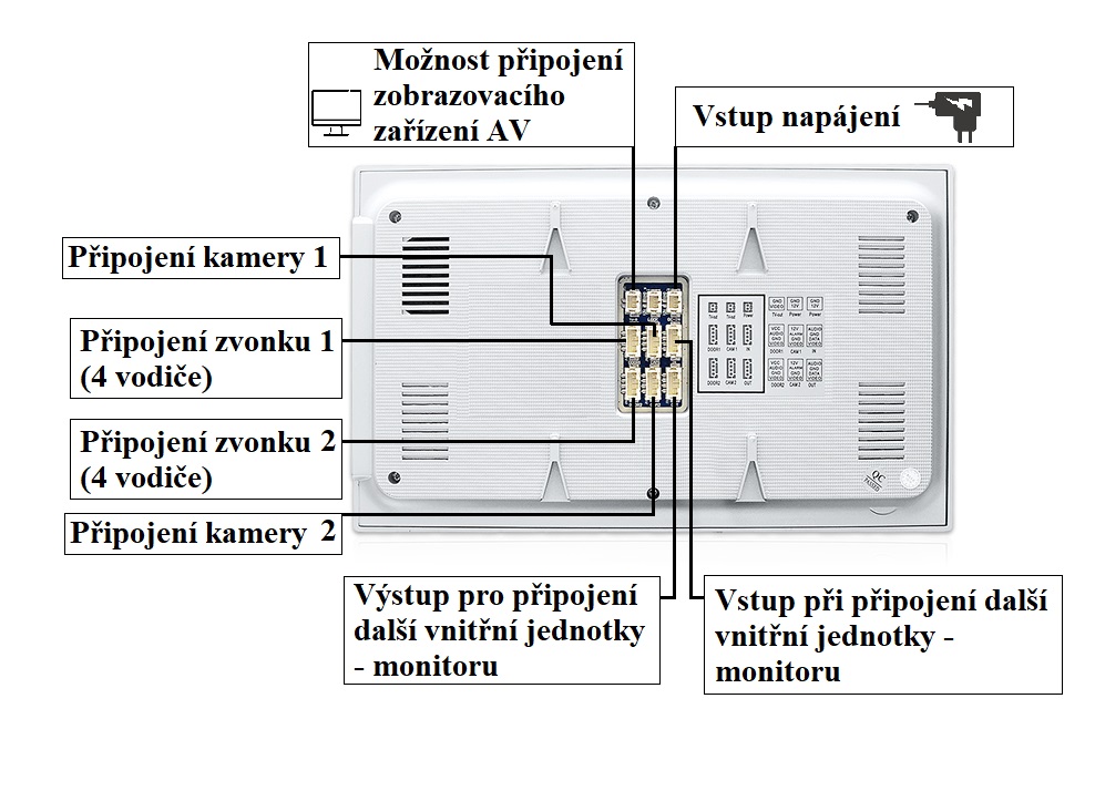 Externí zařízení: tato sada podporuje také zapojení přídavných zařízení, jako je elektrický zámek, CCTV kamera nebo dodatečné monitory. Lze připojit až 2 video zvonky, 6 ovládacích monitorů, 2 CCTV kamery (CVBS, AHD 2Mpx), 1 externí monitor (pouze zrcadlení ovládácího monitoru), 2 detektory/čidla pro spuštění nahrávání připojených kamer.