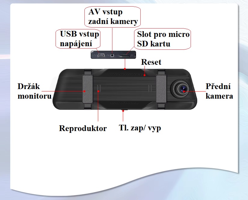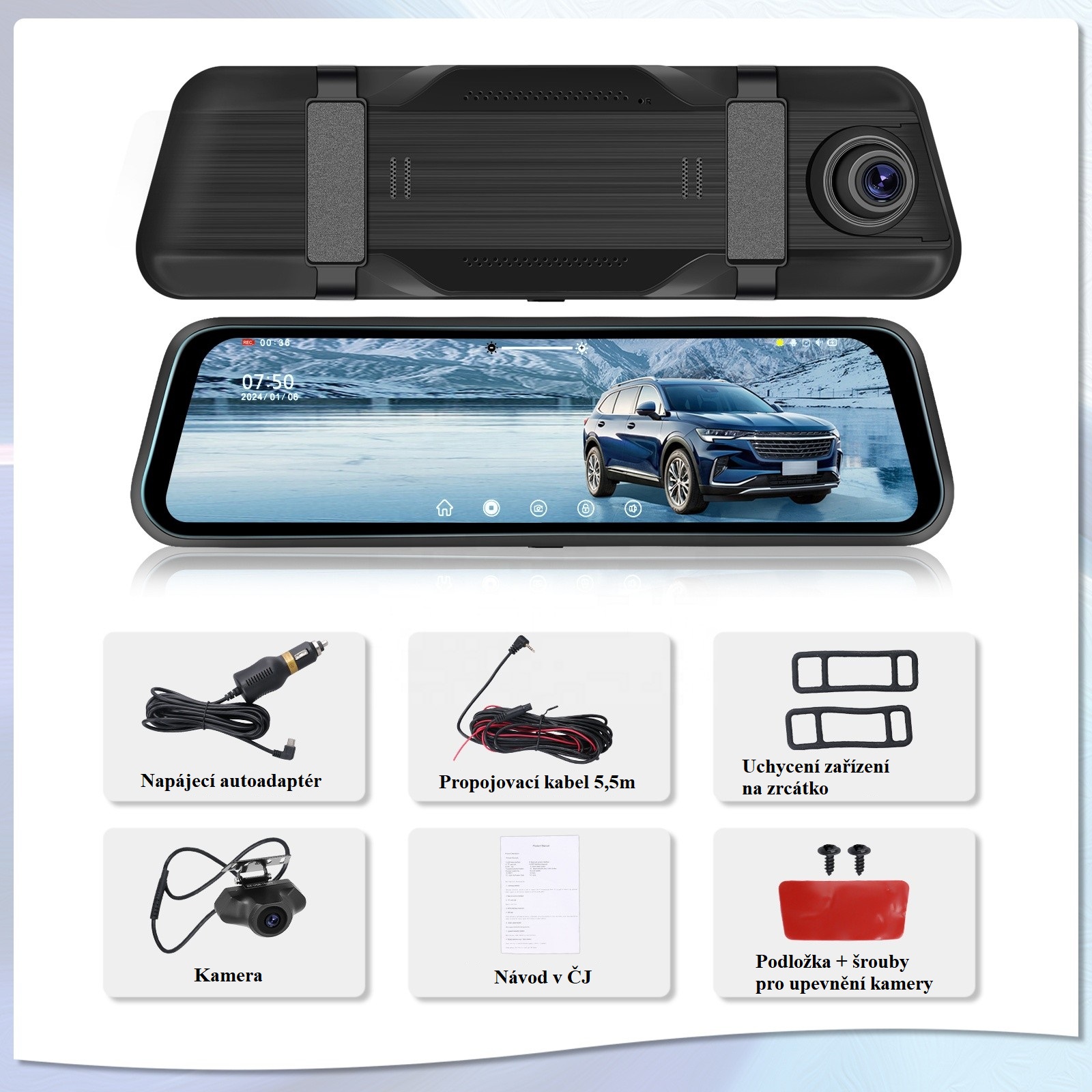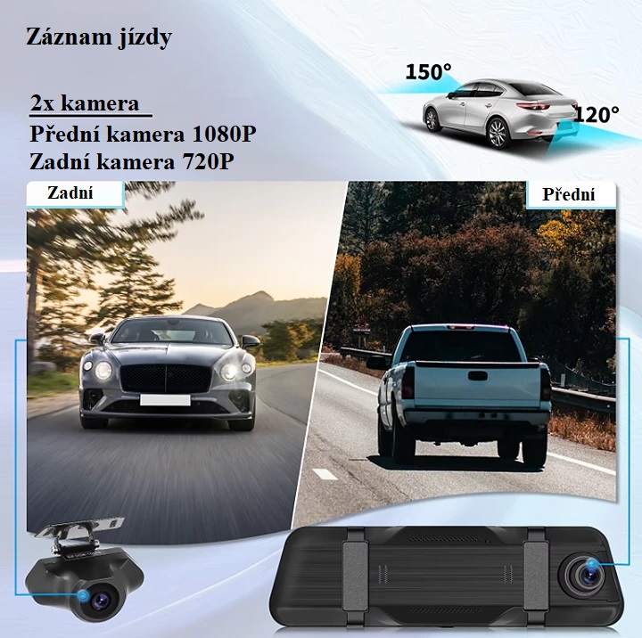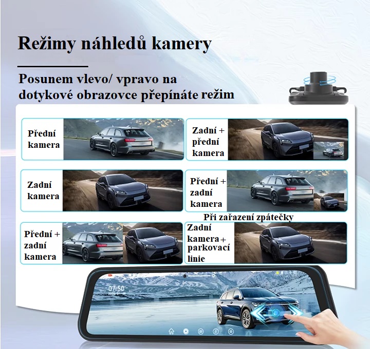 Parkovací set s přední i zadní kamerou, kdy pro zobrazení obrazu kamer slouží monitor ve zpětném zrcátku s dotykovým displejem o velikosti 9,66 palce. Umožňuje přehled kolem vašeho vozu, včetně záznamu z jízdy.