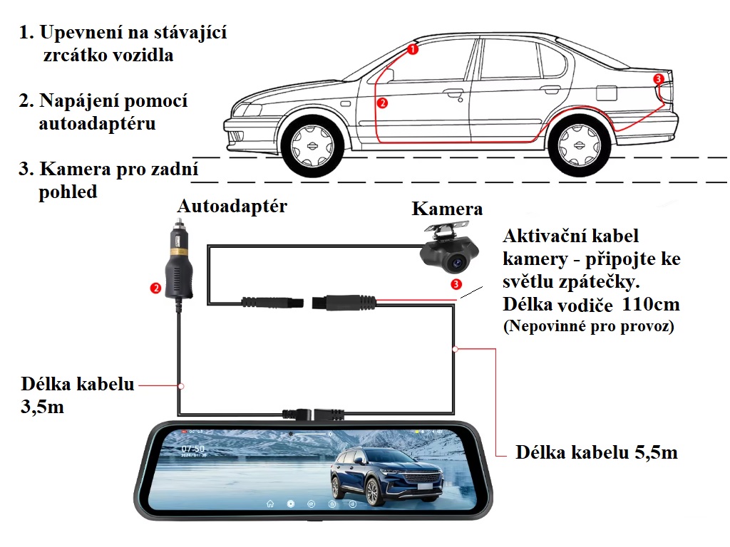 Jednuše upevněte monitor na stávající zrcátko vašeho vozidla, připojte kameru a zapojte do autozapalovače pomocí přiloženého autoadaptéru.