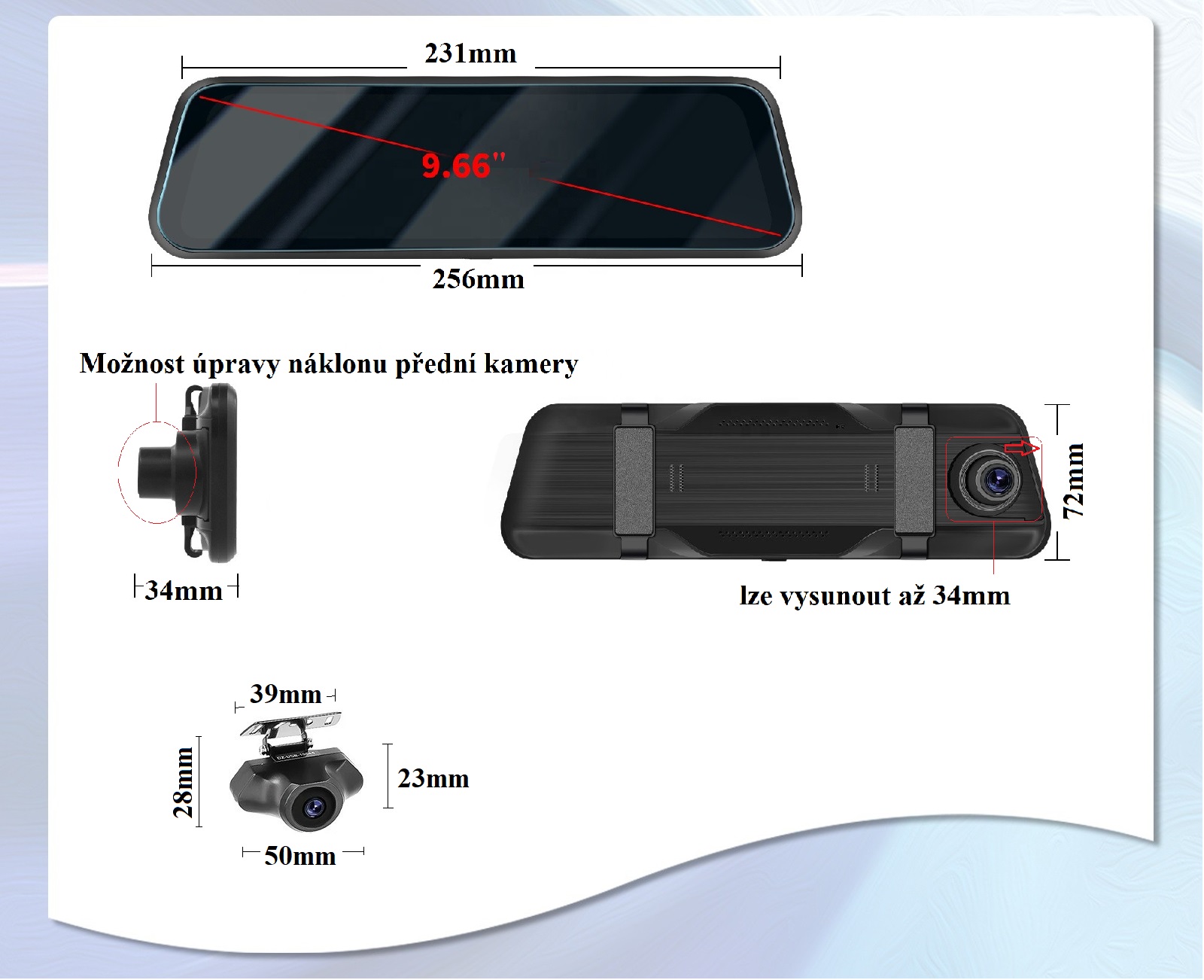 Parkovací set W8187 zpětné zrcátko s přední kamerou + parkovací kamera – 9,66" dotykový IPS monitor - Cena: 1298 Kč