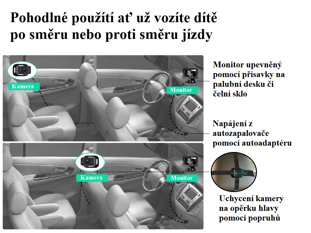 Velmi snadná instalace, kdy monitor upevníte pomocí držáku na palubní desku vozidla či čelní sklo, kameru upevníte na opěrku hlavy sedadla pomocí přiložených popruhů a zapojíte do autozapalovače pomocí přiloženého autoadaptéru.