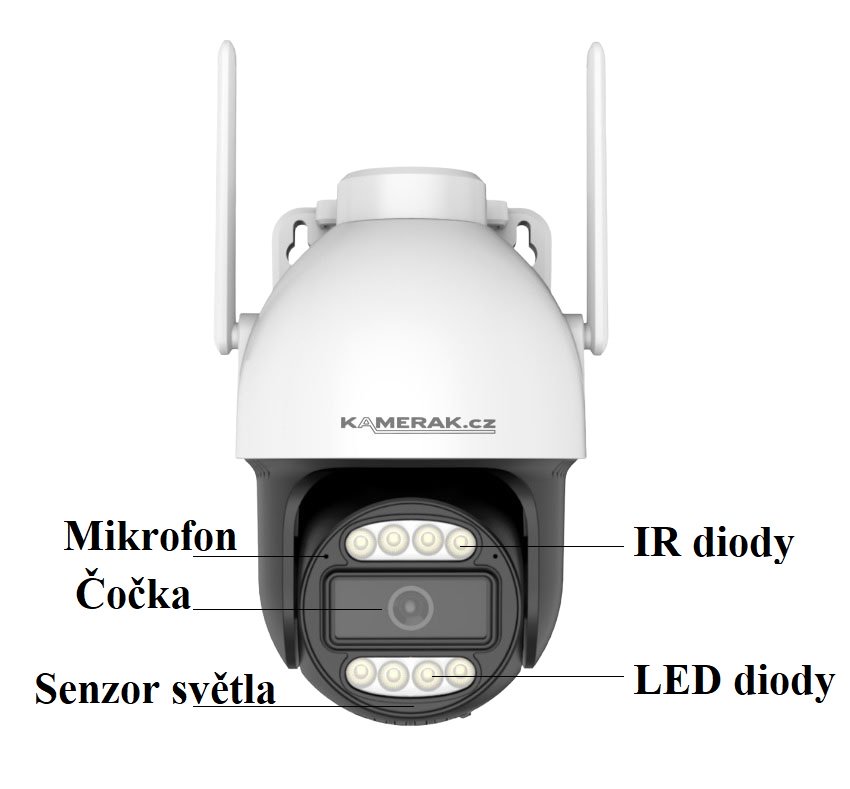Kamera je vybavena jak IR tak i LED diodami, které zajišťují obraz také v noci. IR diody (infračervené diody) Vám vytvoří čistý černobílý obraz a toto světlo není lidským okem vidět, zatímco LED diody rozsvítí bílé světlo čímž umožní kameře barevné zobrazení.