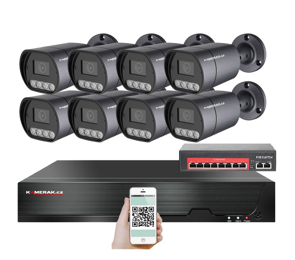 IP kamerový set s externím PoE pro jednoduché sestavení svépomocí. NVR v sobě nemá instalováno napájení kamer, které je řešeno pomocí switch. Lze tedy umístit switch (napájení IP kamer) na jiné místo než rekordér, který se následně připojuje k obrazovce/internetu.