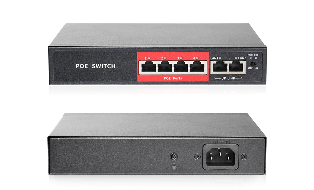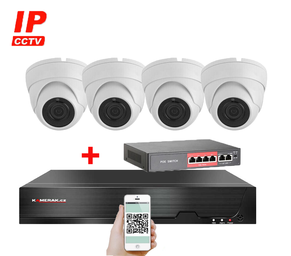 IP kamerový set s externím PoE pro jednoduché sestavení svépomocí. NVR v sobě nemá instalováno napájení kamer, které je řešeno pomocí switch. Lze tedy umístit switch (napájení IP kamer) na jiné místo než rekordér, který se následně připojuje k obrazovce/internetu.