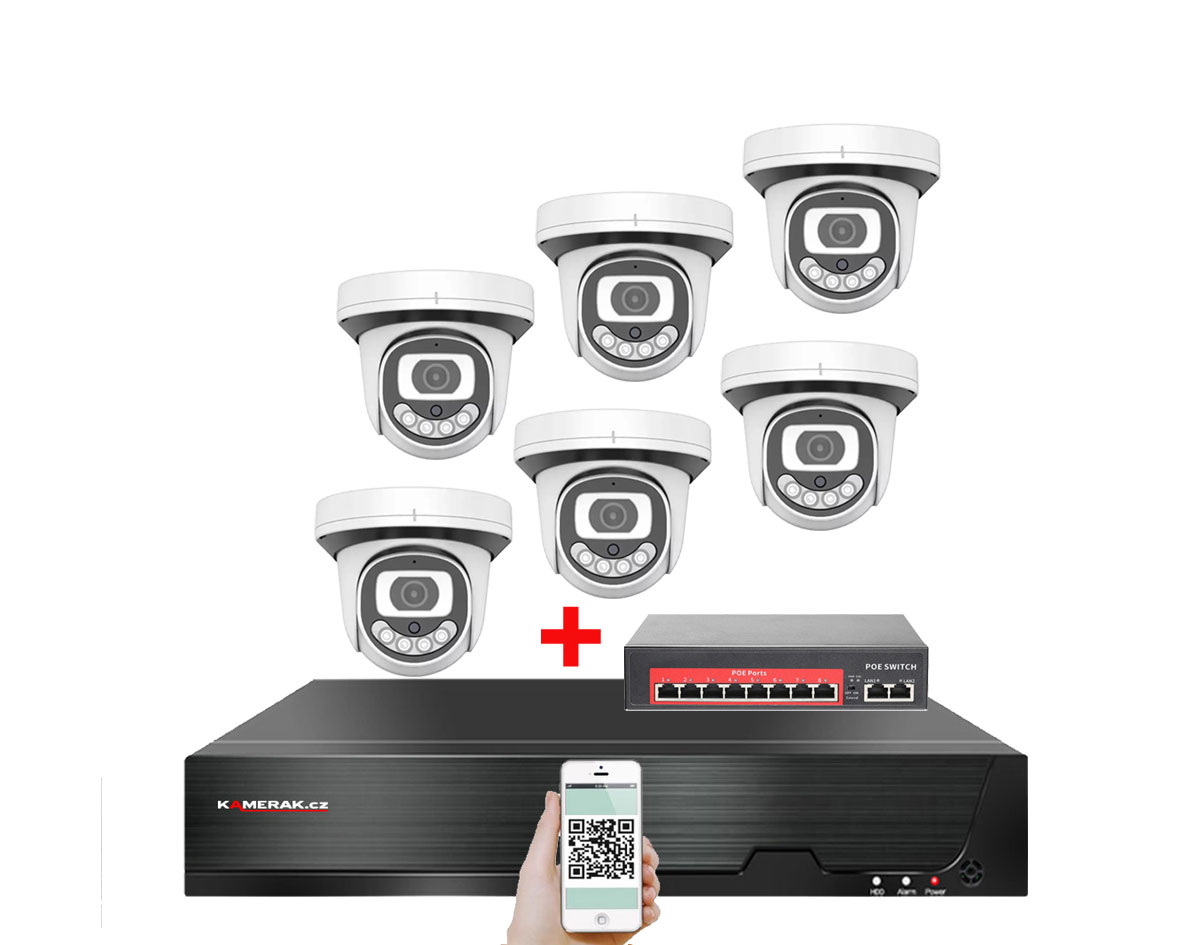 IP kamerový set s externím PoE pro jednoduché sestavení svépomocí. NVR v sobě nemá instalováno napájení kamer, které je řešeno pomocí switch. Lze tedy umístit switch (napájení IP kamer) na jiné místo než rekordér, který se následně připojuje k obrazovce/internetu.